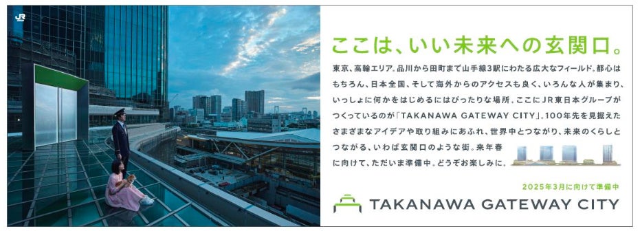 2025年3月のまちびらきに先がけて、TAKANAWA GATEWAY CITYの広告展開をスタートします。 「ここは、いい未来への玄関口。」をキーメッセージに、俳優の「堤真一」さんと「當真あみ」さんを起用し、11月1日よりテレビCMの放映を開始するほか、TAKANAWA GATEWAY CITY公式 HP や公式YouTubeチャンネルなどでメッセージを発信していきます。
