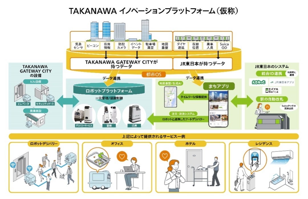 TAKANAWA GATEWAY CITYでは都市OS※4に集められたデータを中心に、ロボットプラットフォ ームや街独自のアプリがサービスを提供します。街から得られるデータに加えて、当社が持つ鉄道や駅のデータやKDDIが有する人流データなどを蓄積・分析することで、街に訪れるすべての方を支える快適なサービスを実現します。
