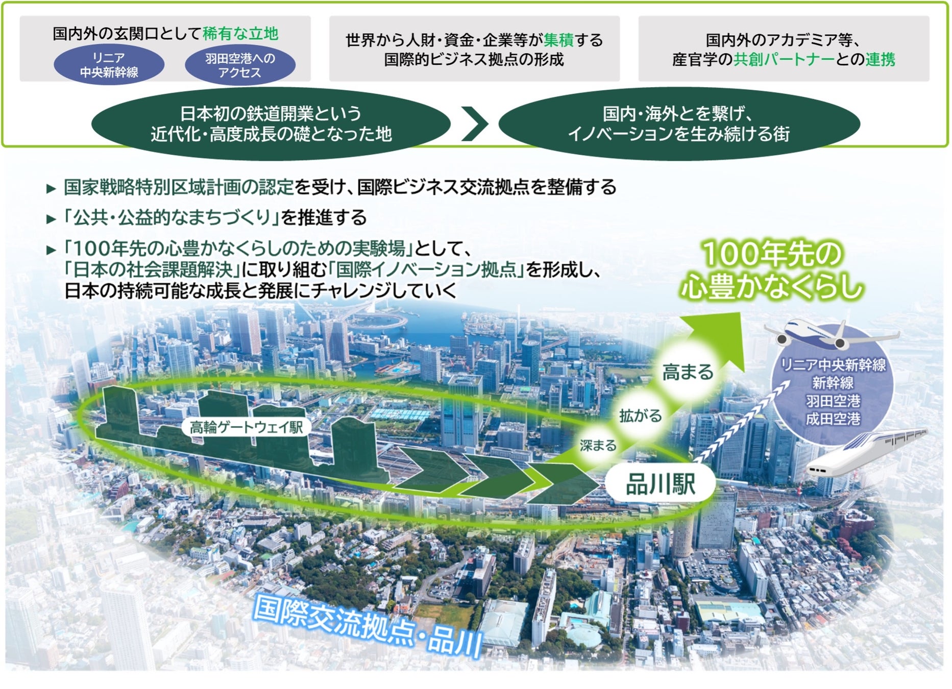 明治期の先人達が築いた近代化の礎は、イノベーションのDNAとして高度成長期を経た今も生き続けており、このプロジェクトを通して大きな旋律を奏で始めようとしております。さらに今後の開発を視野に入れ「国際交流拠点・品川」の発展をけん引していくように、深まり、拡がり、高まっていくことで、「地球益」の実現に向け進化し続けていく街をつくっていきます。