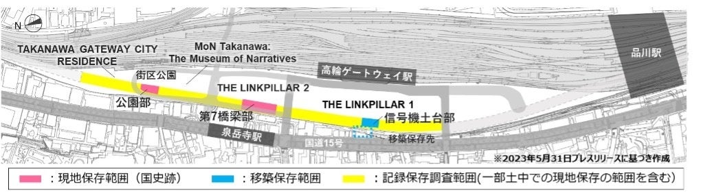 まちびらきにあわせ、高輪リンクライン(別紙参照)において、高輪築堤の特徴である海側と山側の石積みを再現し、開業期の鉄道が走ったライン上にレールを埋込むなど、高輪築堤の歴史をリアルに感じられる空間づくりを行います。