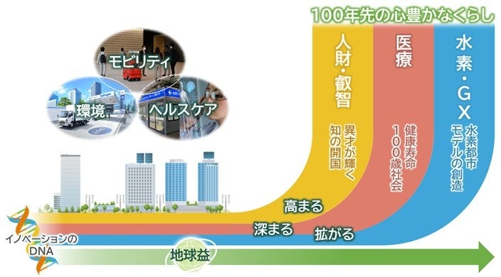 JR東日本は、「課題先進国」日本が抱える社会課題を踏まえ、日本が世界で活躍・再浮上していくきっかけをこの場所から生み、100年先の心豊かなくらしを実現するために、「人財・叡智」「医療」「水素・GX※5」を軸に「地球益」の実現に繋がる取組みを行っていきます。