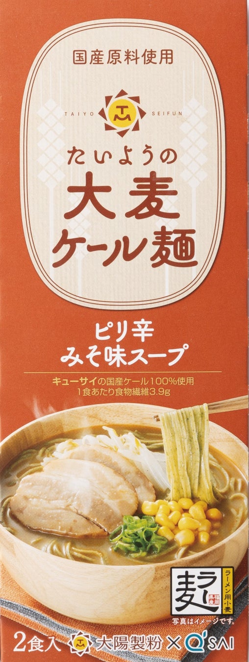 「たいようの大麦ケール麺」は九州産の大麦を使用、1食80g当たりの食物繊維量は3.9g、現代人の足りない食物繊維を補います。