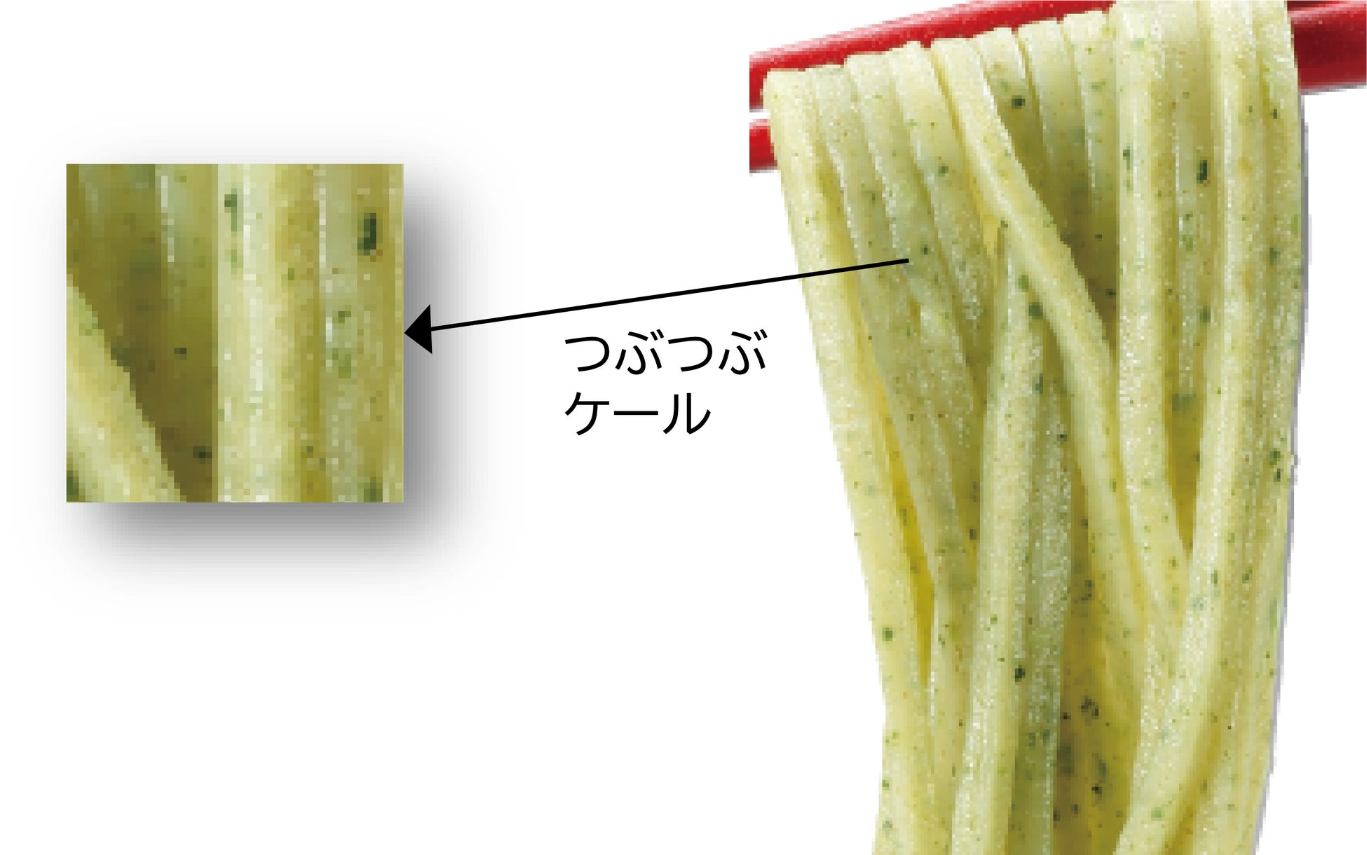 また、ケールの風味と食感を楽しんでいただくため、パウダー状のケールと粒感を残した粉砕ケールの2種類のケール原料を使用し麺帯に練りこんでいます。