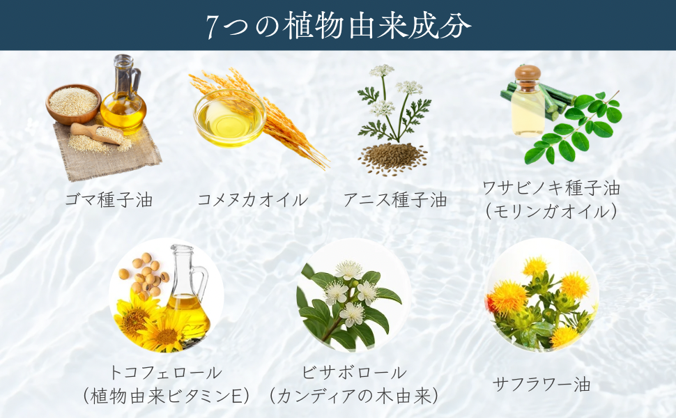 セサミオイル、コメヌカ油、モリンガオイルなど7種の植物由来成分を配合。