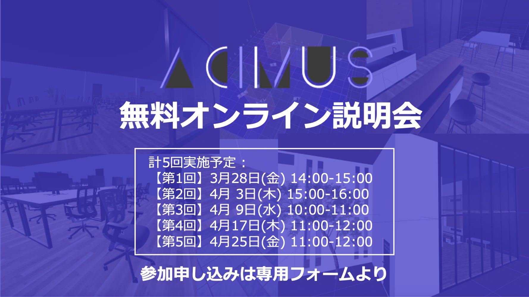 β版無料トライアルの定員達成後も多くの企業様からご関心をお寄せいただくことを受け、このたびは気軽にご参加いただける『ACIMUS』の無料オンライン説明会を開催いたします。