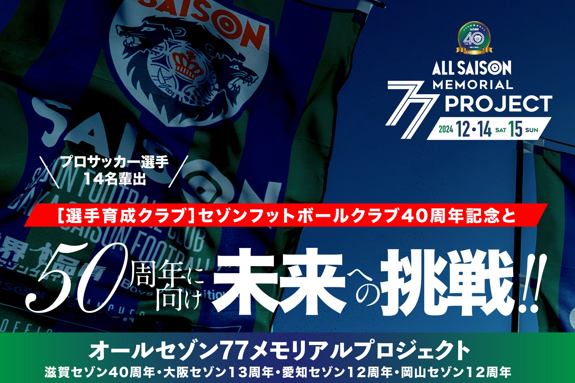 2024年12月15日(日)、滋賀県大津市にてセゾンフットボールクラブ(運営法人:株式会社ウインズコーポレーション、以下セゾンFC)が、「セゾンフットボールクラブ40周年記念・オールセゾン77メモリアルパーティー」を開催いたしました。当日は現選手、保護者、OB、スタッフ、関係者など約300名の方々にご参加いただきました。年の瀬のご多忙の中、ご参加いただきました全ての方々へ心より御礼申し上げます。本イベントは、クラブの歴史と未来を支えるオールセゾンファミリーへの感謝を込め、クラブのさらなる発展を目指しました。今後も当クラブの活動環境の充実を図るべく、12月26日(木)までクラウドファンディングも実施しております。引き続き、ご支援のほどよろしくお願い申し上げます。