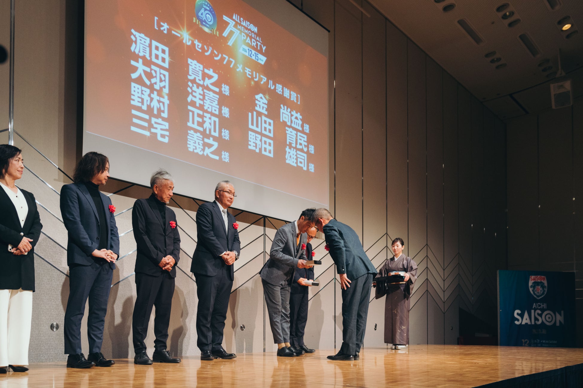 セゾンFCは、1984年に滋賀県内初のクラブチームとして創設されて以来、40年という長い年月の中で卓越したセンス、高いテクニックに溢れる魅力ある選手を育成してまいりました。その中からスペインラ・リーガやワールドカップで活躍した乾貴士選手(清水)らをはじめ14名のプロサッカー選手を輩出、今では滋賀だけでなく、大阪、愛知、岡山でもクラブを展開しております。今年で創設40周年を迎えるにあたり、長年のご支援に対する感謝の意を表し、「セゾンフットボールクラブ40周年記念・オールセゾン77メモリアルパーティー」を開催いたしました。オールセゾンとして、滋賀のみならず、13周年を迎えた「大阪セゾン」それぞれ12周年を迎えた「愛知セゾン」「岡山セゾン」のこれまでの歴史を振り返り、功績を讃えました。さらに、ここ10年間のこのクラブに多大な貢献をされた7名に「オールセゾン77メモリアル感謝賞」が贈られました。