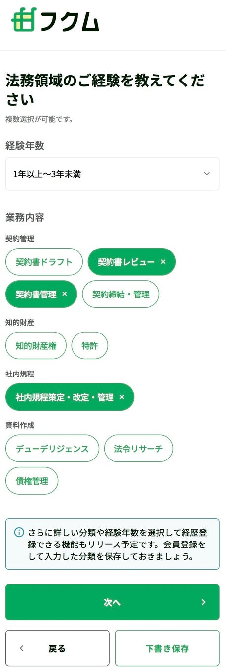マイページでは、利用者自身のスキルの編集だけでなく、希望条件や経歴も簡単に入力でき、案件のスカウトをより受け取りやすくなります。フクムの利用開始時と同様に、選択肢から選ぶだけなので手軽に編集できます。