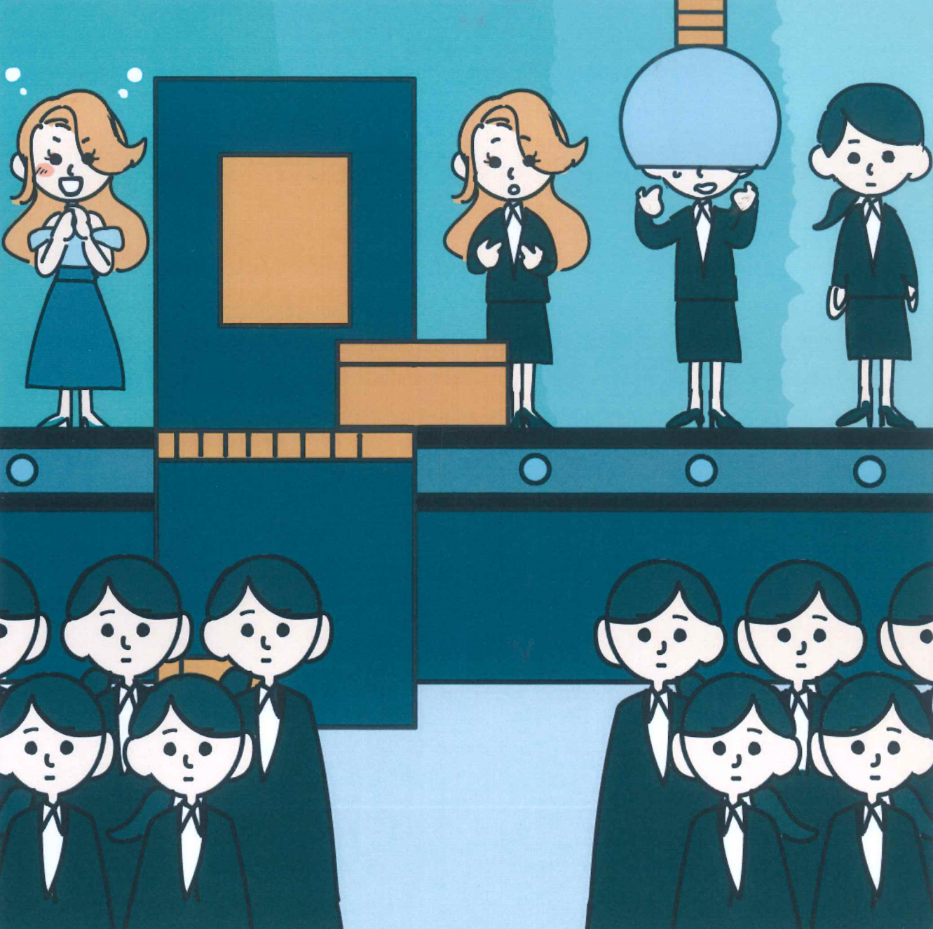 このイラストは就活での「なんでや!」をイラスト化しました。現在3年生となった私たちの学年は、インターンシップなどの応募や教育実習などが始まり、髪色に気を使う人が増えてきています。就活では「みんなと同じ」ことが求められ、その様子を規格化された量産品のようだと感じました。明るい髪色が似合う友人やずっとオシャレだった同級生が段々と個性を消して同じになっていく様子を見ていて、日々悲しい気持ちになっています。欧米では髪色やピアスについて就活での制約がないらしく、いずれ日本もそういった個性を認める就活に変わればいいのにという、私の切実な思いを込めて描きました。
