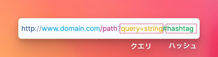 また、クエリとハッシュとはURLの中のそれぞれ、「?のあと」、「#のあと」にある文字です。