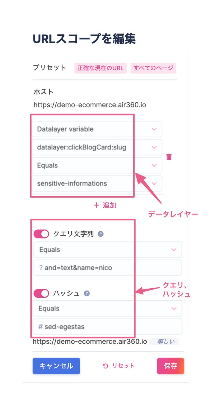 ページ上分析機能では、表示しているページだけではなく、例えばカテゴリーごとや特定のグループごとの分析をURL等の情報を用いて行えるよう往来からなっていましたが、今回のアップデートで分析ページの定義にデータレイヤーやハッシュそしてクエリなどの情報も使えるようになりました。
