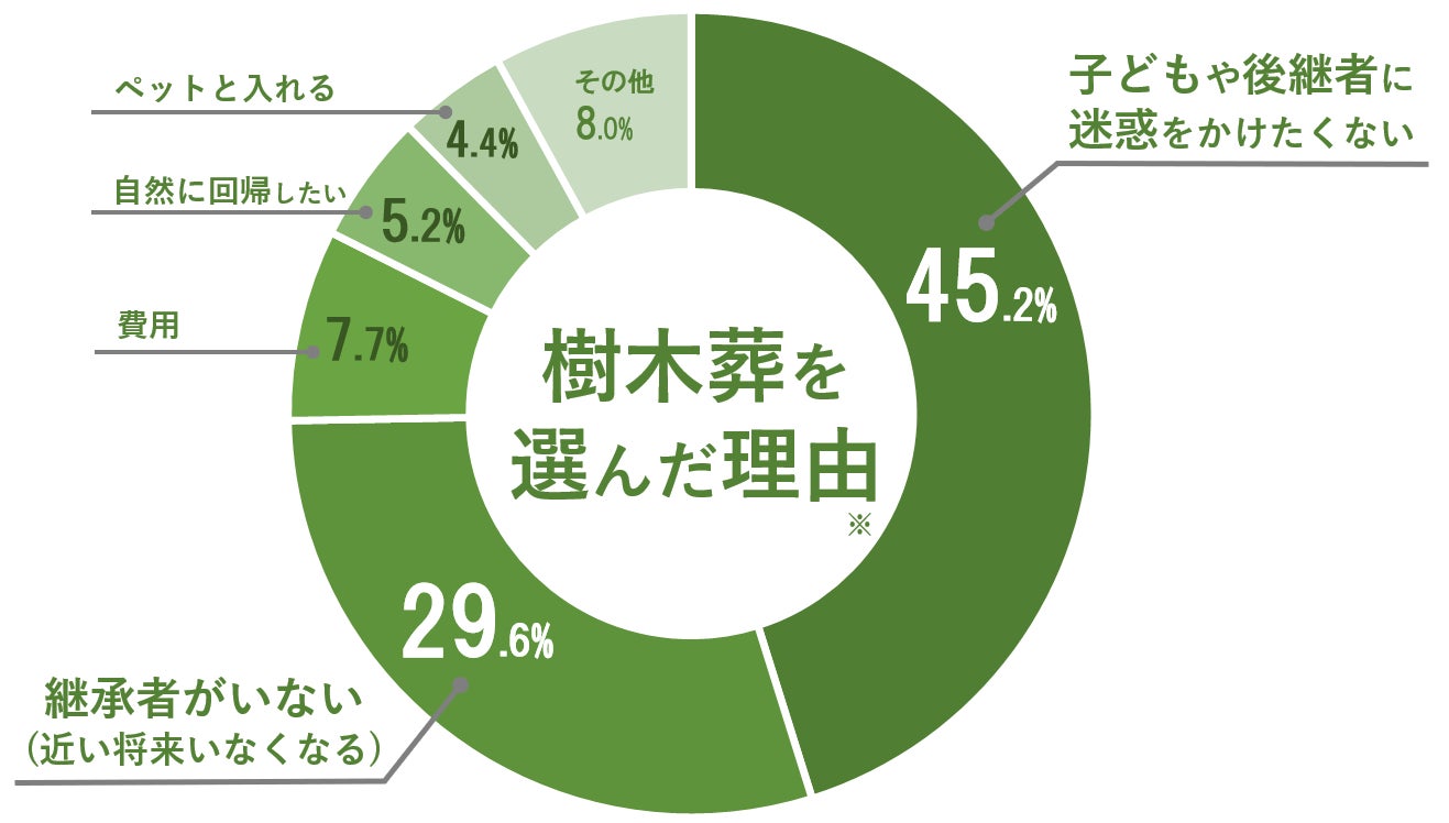 調査によると、樹木葬を選ぶ理由として最も多かったのは「子どもや後継者に迷惑をかけたくない」が45.2%、次いで「継承者がいない(近い将来いなくなる)」が29.6%という結果が出ています。