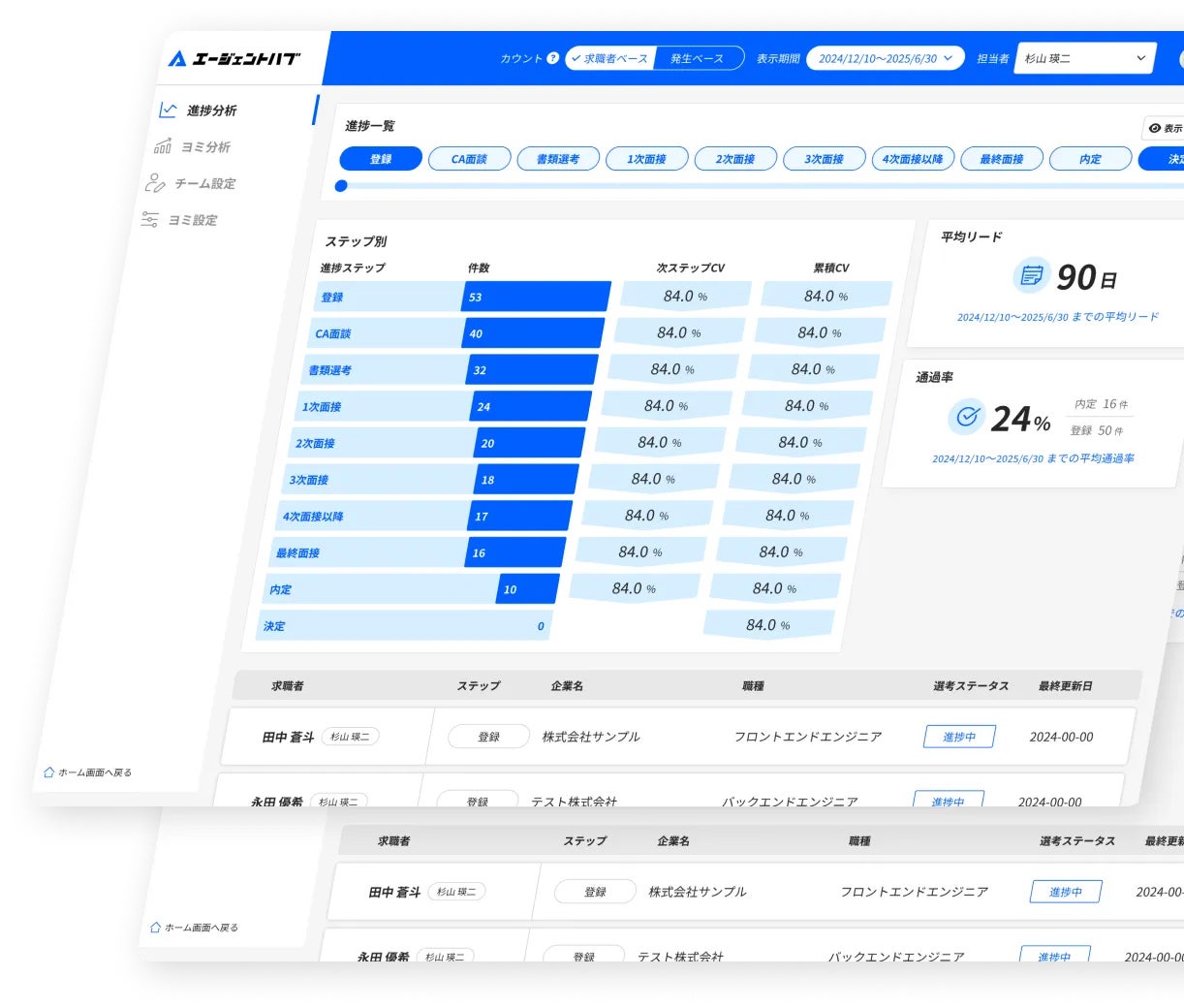 選考通過率や成約率などの主要な指標を集計し、チーム全体・個人単位での目標達成度を把握できます。多角的な視点から課題を分析し、ボトルネックを特定することで、より効果的な戦略策定を支援します。