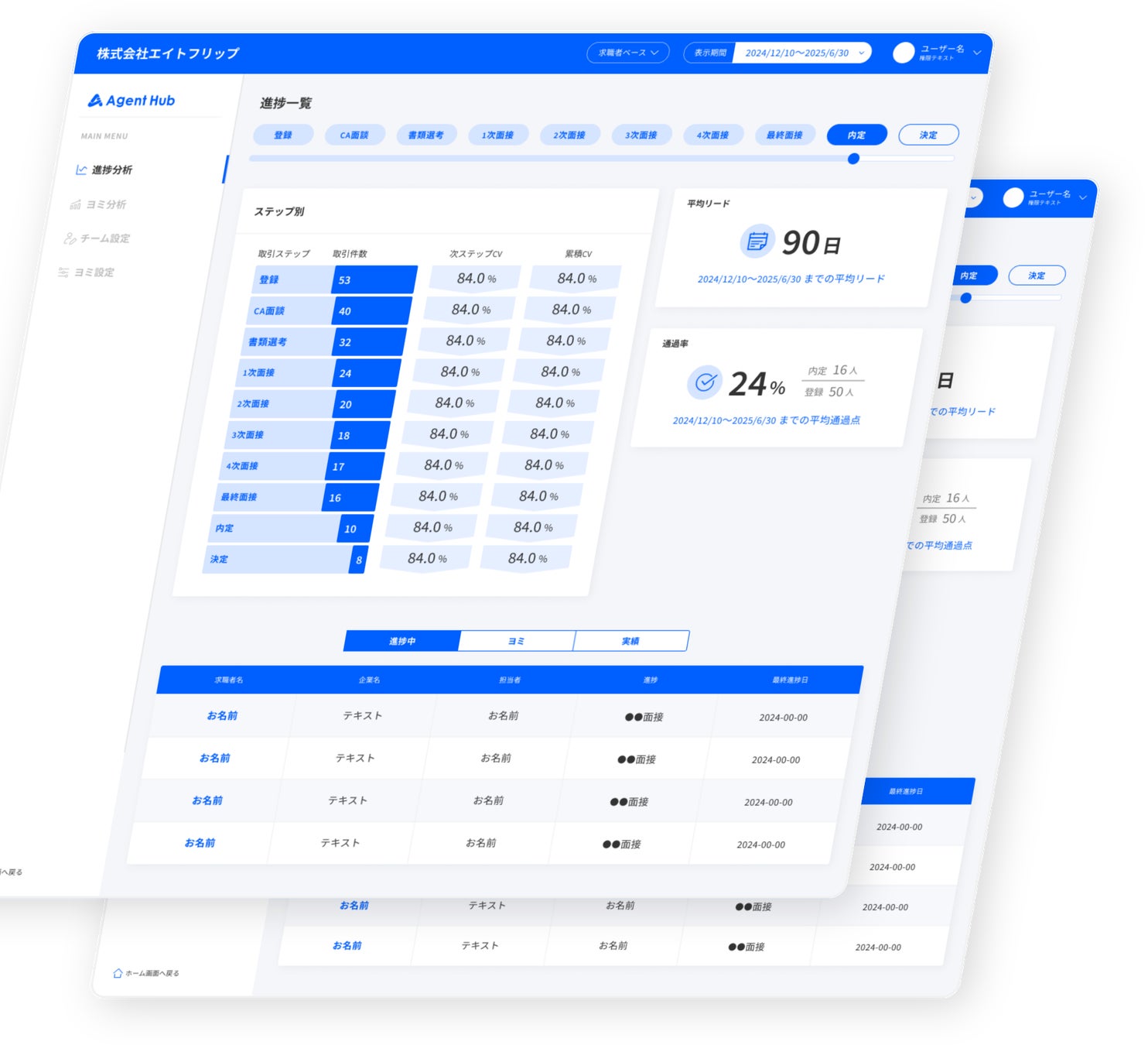 求職者との日々のコミュニケーションを記録できるだけでなく、面談や選考状況を直感的に確認できるダッシュボードを搭載しています。求職者一人ひとりの状況をタイムリーに把握し、適切な対応を促すことで、業務効率化に貢献します。