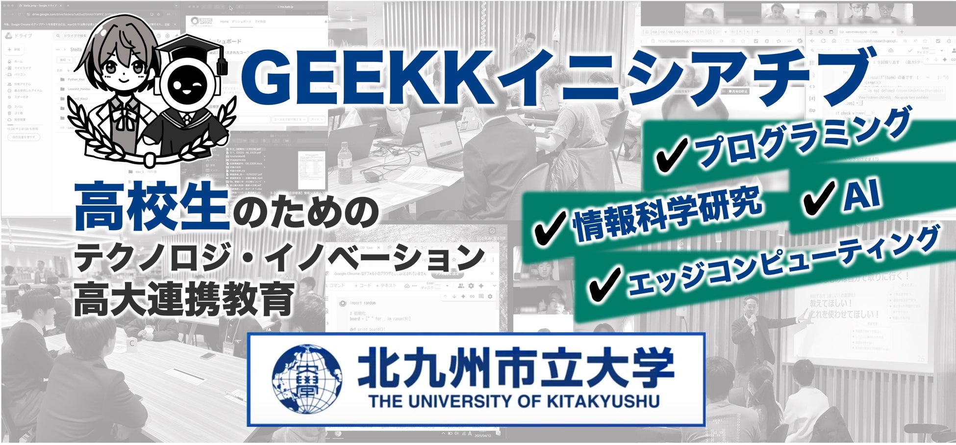 GEEKKイニシアチブは、国立研究開発法人科学技術振興機構(JST)が実施する次世代科学技術チャレンジプログラム(通称 STELLAプログラム)として、令和6年度に北九州市立大学が採択された事業です。