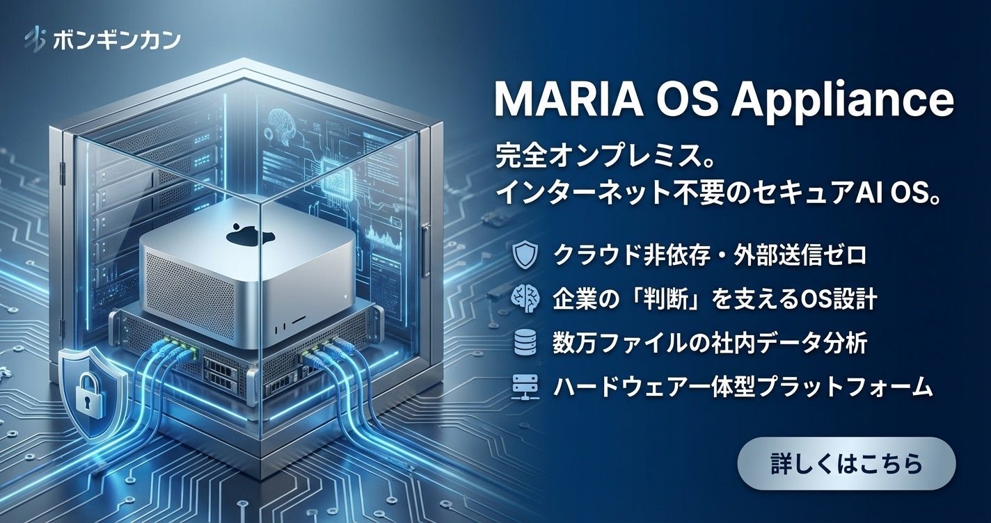ボンギンカン株式会社(本社:東京都江東区有明、代表取締役社長:坪内弘毅、以下「ボンギンカン」)は、企業の判断を支えるオンプレミス型AI判断OS「MARIA OS Appliance(マリア・オーエス・アプライアンス)」の提供を開始したことをお知らせいたします。