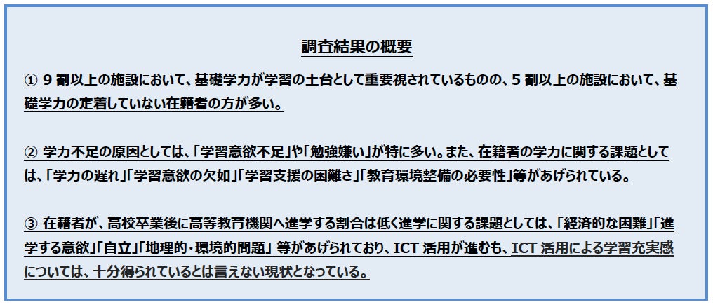 調査の結果から、多くの施設において、基礎学力をはじめとする学力が十分定着していない子どもが多く、施設でのICT導入が7割と進んでいるにもかかわらず、中でも「勉強嫌い」や「学習意欲の低い状況」が原因でそのあることがわかりました。