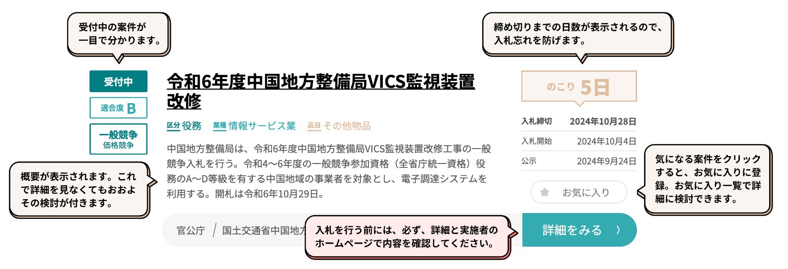 (2) 注目案件はお気に入り登録で、締切日アラート機能で申請漏れ防止