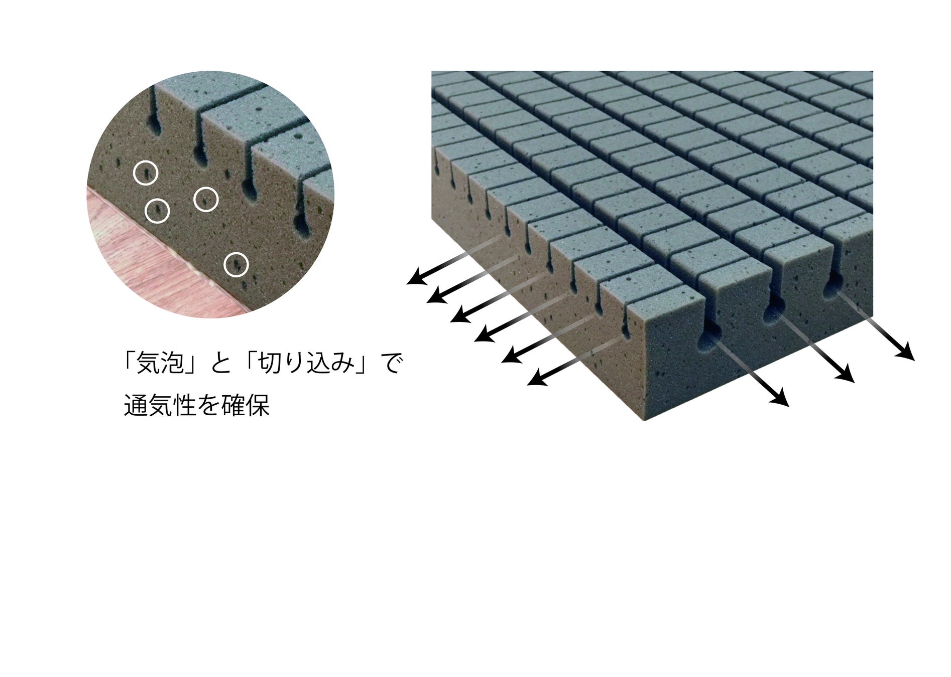 また特殊カッティングにて縦・横・深さの溝を作ることで通気性が向上します。