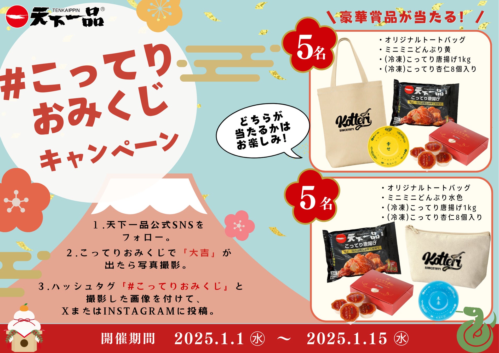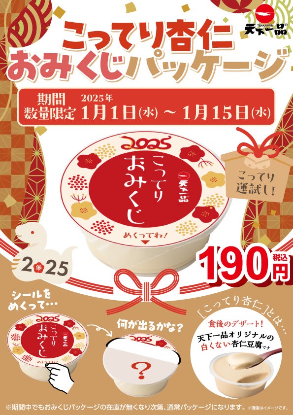 京都北白川発祥、鶏がらと野菜などをじっくり炊きだして作られたこってりスープが人気の中華そば専門チェーン店「天下一品」(本社:滋賀県大津市、グループ累計211店舗を展開中※)は、2025年1月1日(水)から1月15日(水)までの期間、「こってり杏仁」がおみくじパッケージになってご提供いたします。※2024年12月28日(土)時点での店舗数です。