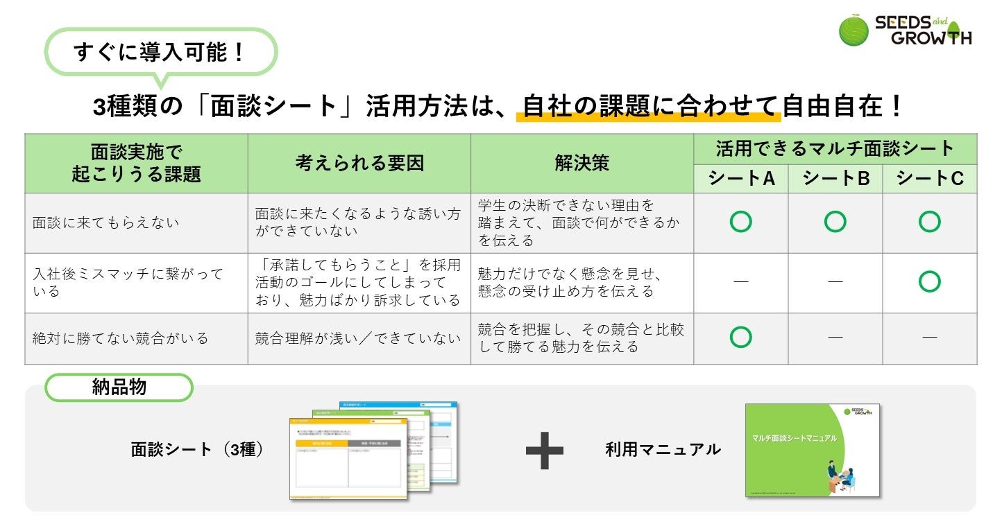 新卒採用専門コンサルティング会社のシーズアンドグロース株式会社(本社所在地:東京都中央区、代表取締役:河本 英之)は、このたび「マルチ面談シート」を新たに開発し、サービス提供を開始いたします。
