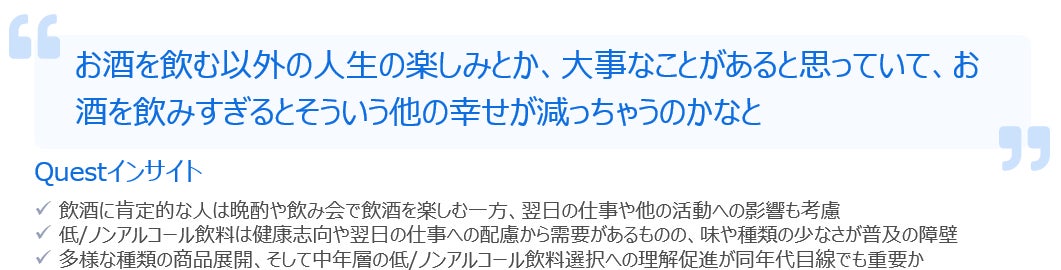 株式会社Quest Research(本社:東京都港区、代表取締役:南健太)は、酒類メーカー各社が近年掲げている「スマートドリンキング」「スロードリンク」「DRINK SMART」等の施策(所謂ソバーキュリアス文化の啓発や提案)について、生活者がどのように感じているかを飲酒習慣の実態と合わせて調査しました。