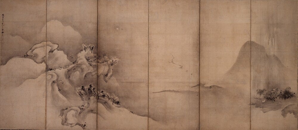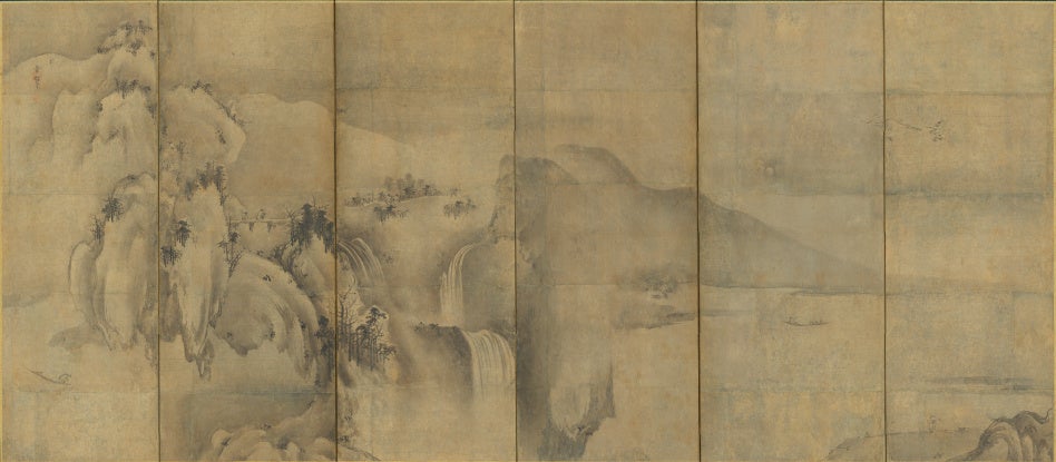 雪村は、佐竹氏や蘆名(あしな)氏、北条氏といった戦国大名のもとで、古典となる中国南宋時代の牧谿(もっけい)や玉澗(ぎょくかん)といった絵師たちの絵を学び、自己の画風に受容していったとみられます。本章では、《四季山水図屏風(しきさんすいずびょうぶ)》(郡山市立美術館)や最晩年の《瀟湘八景図屏風(しょうしょうはっけいずびょうぶ)》(個人)をなどから、雪村の山水画における筆様(ひつよう)の展開を探っていきます。
