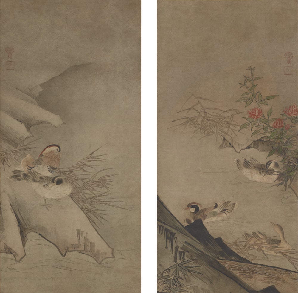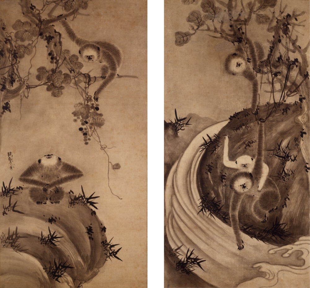 雪村は国内外を問わず人気を博しており、海外に渡った作品も少なくありません。当館所蔵の《猿猴図(えんこうず)》2幅は、フリーア美術館所蔵の《寿老人図(じゅろうじんず)》と合わせて3幅対として伝来していましたが、現在は分かれて所蔵されています。
