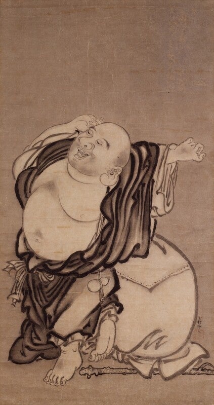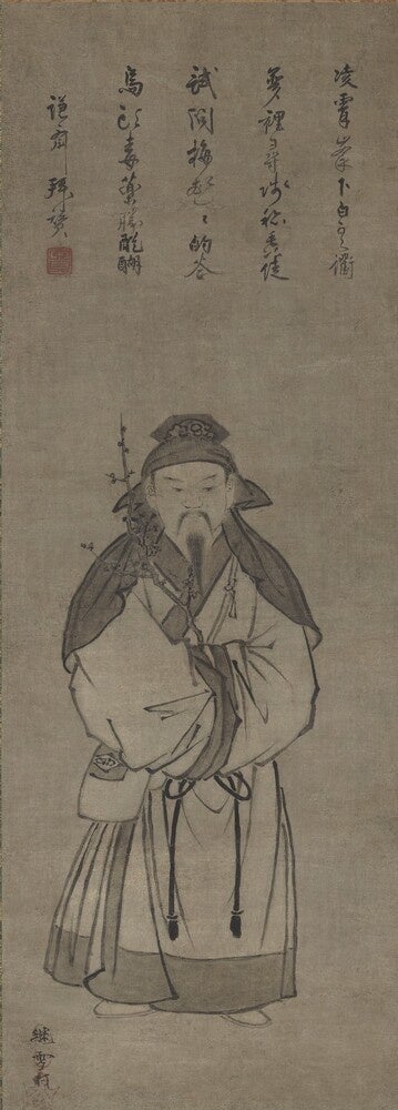 雪村の特徴がより示されるのは、大胆な筆致が用いられた人物画です。風を受けて翻るうねりのある衣文(えもん)、奇怪さを伴う面貌表現は画面に躍動感を与え、鑑賞者を水墨画の世界へ誘います。ダイナミックに力強さをあらわした《鐘馗図(しょうきず)》(個人)や愛嬌ある顔つきで描かれた《欠伸布袋図・紅白梅図(あくびほていず・こうはくばいず)》(当館)などから、雪村画の真骨頂をご覧いただきます。