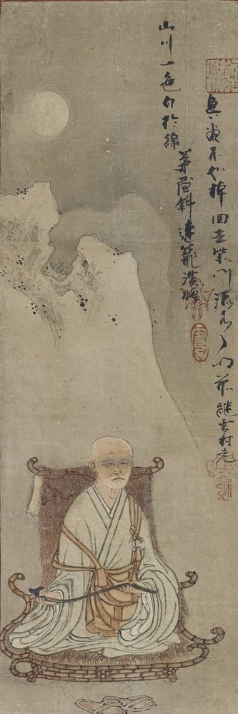 雪村は、禅僧でありながら絵を描く画僧でした。彼の作品の中には、景初周随 (けいしょしゅうずい)や策彦周良(さくげんしゅうりょう)といった禅僧の賛(さん)が付されたものもあり、京都や鎌倉の五山僧と繋がりがあったことが確認できます。こうした禅僧との交流は、寺院に所蔵されていた古画を実見し、画才を磨くことにも役立ったと見られます。ここでは、雪村が晩年に描いた《自画像》(大和文華館)や《渡唐天神図》(茨城県立歴史館)から、禅僧としての画業について見ていきます。