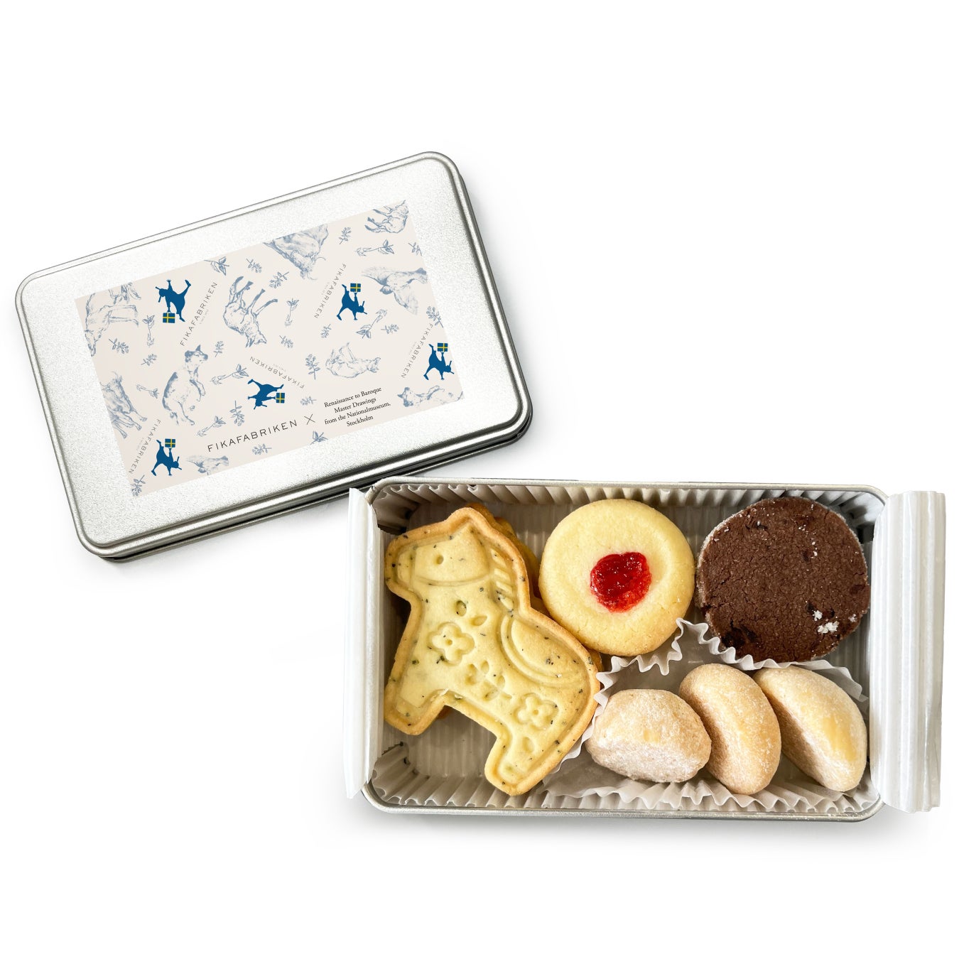 フィーカファブリ―ケンのロゴと本展の出品作品をあしらったオリジナル缶に、人気の紅茶のサブレをはじめとした焼き菓子を詰め合わせて販売します。