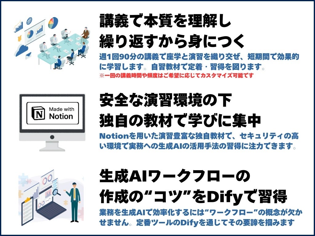・特徴:生成AIの基礎から始め、最終的にDifyを通じた生成AIワークフローの構築を通じて、ビジネスパーソンに必要な生成AIの必須スキルを習得