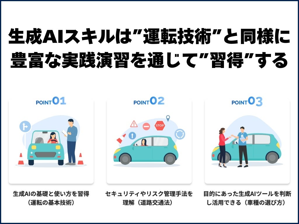 生成AI教習所では、運転技術の習得と同様に、「実践的」で「安全な環境」で演習を繰り返し行うことが特徴で、"自然と手が動く" レベルまで生成AIスキルを習得できます。進化の著しい生成AI領域では、本質を掴んだ上で、情報に踊らされることなく業務に活かせる技術を見極められることが肝要です。