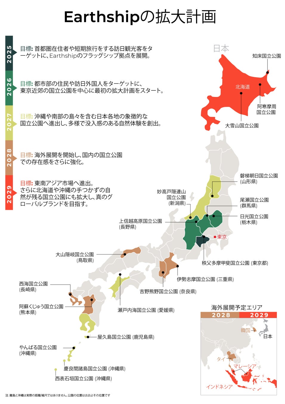 2029年: 東南アジアでの展開をさらに拡大しつつ、日本国内では北海道から沖縄まで全国の国立公園を網羅。自然体験を通じて、地域の活性化と持続可能な観光を推進。グローバルなホスピタリティブランドとしての地位を確立します。