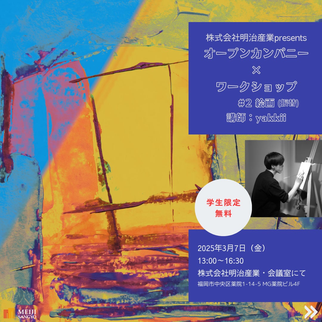 株式会社明治産業(福岡県福岡市:代表取締役 明永喜年)は、 採用企画の一環として大学生を対象とした「オープンカンパニー×アートワークショップ」を3月7日(金)に開催します。学年を問わず、大学生の皆さまに当社のユニークさを体験していただけるプログラムです。