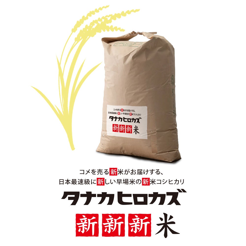 桜島さんは「自分で作った新米を食べたら、外食する気になれないほど美味いです」と断言します。実際、地元の清透な水から産まれたコシヒカリは、粒が大きく、しっかり・もっちり・甘みも感じられる逸品だそうです。「米は買ったことがない」「米は売るほど余っている」と聞けば、タナカヒロカズカンパニーから販売したい。コメを売る新米のタナカヒロカズカンパニーがお届けする、今年の新米の中でもとりわけ新しい早場米ですから、自信を持って「タナカヒロカズ新新新米」とネーミングいたしました。