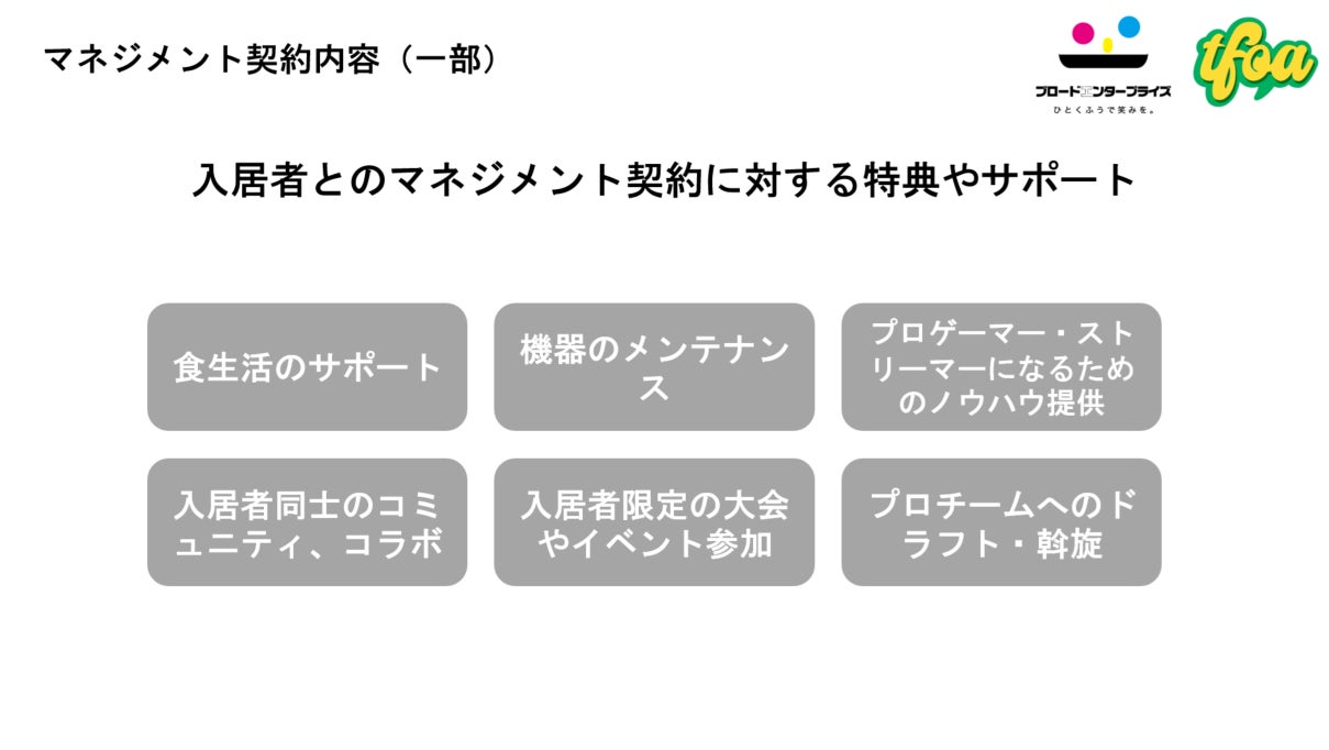 「私たちは、機器のメンテナンスに加えて、本気で稼ぎたいという方に対して、食生活のサポートやプロゲーマー・ストリーマーになるためのノウハウ提供、入居者同士のコミュニティ、コラボ、入居者限定の大会の実施・参加、またプロチームへのドラフト・斡旋など、様々なサポートプログラムを提供します。例えば家賃9万円のものが18万円と倍になったとしても、インフラの投資が分割されているのでリスクが軽減されますし、このマネジメント契約によって新たな収益が見込める可能性があります。このゲーミングハウスに住むことで強くなり、大好きなゲーマーやストリーミングに没頭し、世界で稼げるゲーマー・ストリーマーがここから排出されるのが私たちの夢です」(TFOA代表・島津秀和)。