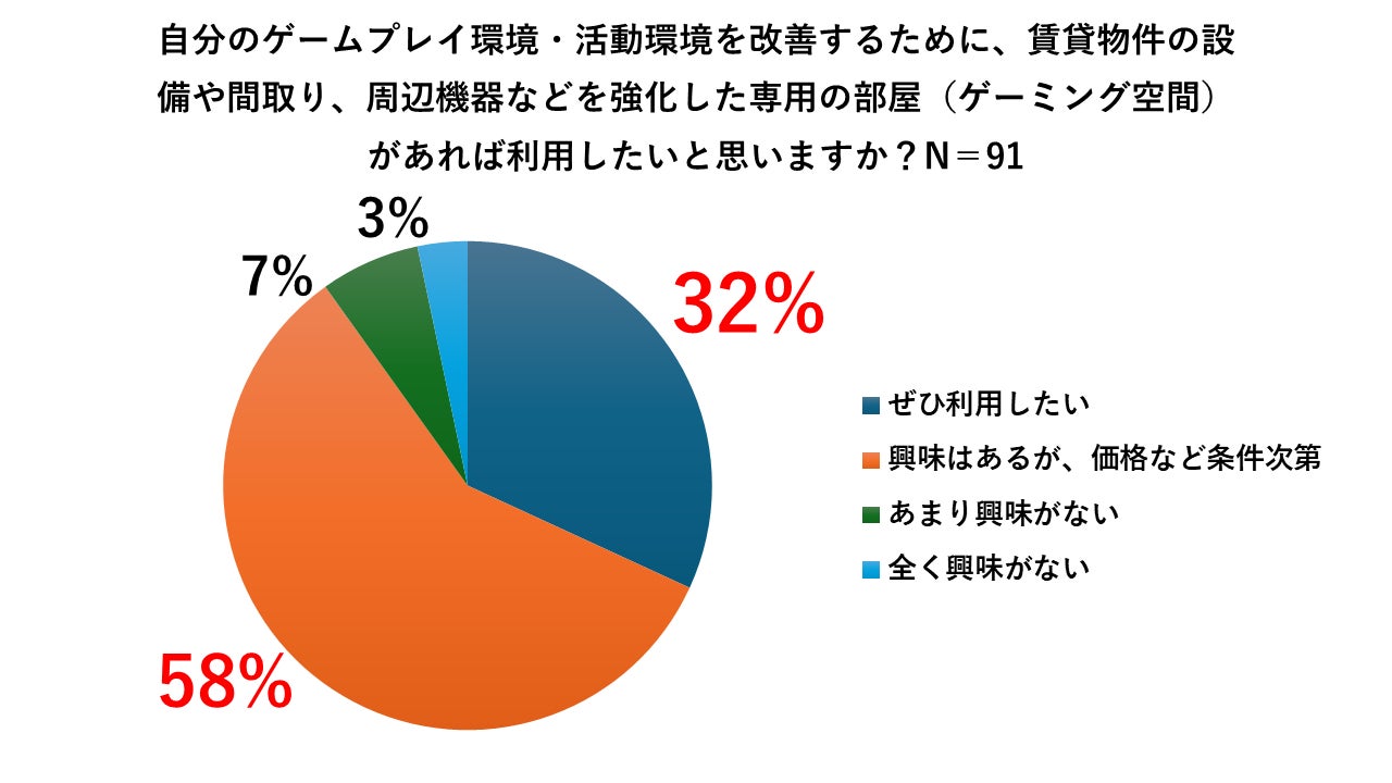 「CREATORZ WORLDが2024年12月に行ったインターネット調査(東京都内在住、20代から30代、男女、N=300、独身、クロスマーケティング社QIQUMO利用)によると、普段からPCを使ってオンラインゲームを行うゲーマー(N=91)の55%が、専用機“ゲーミングPC”を利用せず、“一般的PC”を利用してゲームを行っていると回答しており、そのゲーマーの半数は、回線速度やPCのスペックに不満、約3割が音質・防音に不満を感じているとの回答でした。「そのような不満を解消するインフラが予め整った賃貸物件があれば住みたいか」という質問に対して9割のゲーマーが住みたいという回答でした。この“インフラ”の課題解決が、eSports市場の活性化に繋がるきっかけになるだろう」(TFOA代表・島津秀和)と感じています。