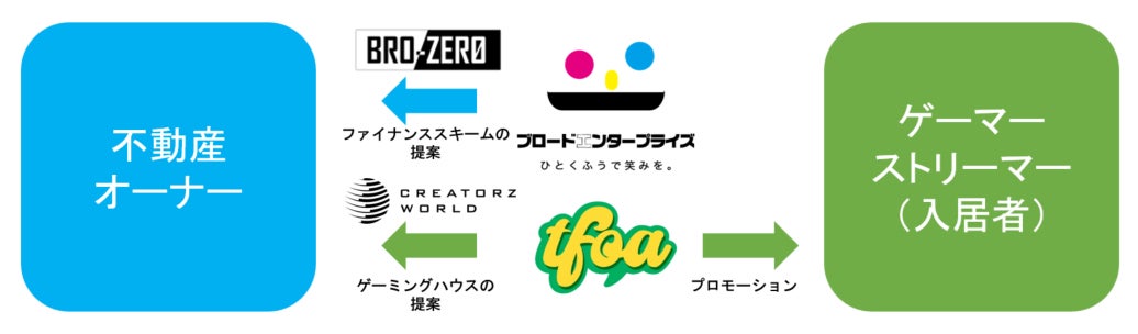 「CREATORZ WORLDゲーミングハウス」を拡販していくためにも、不動産オーナーの理解が必要不可欠です。TFOAはこのたび、金融機関の審査なしに独自のファイナンススキームで様々な設備や投資にかかる初期費用を0円にする「BRO-ZERO」を提供するブロードエンタープライズとタッグを組み、不動産オーナーの負担を軽減することでリノベーション件数を増やしていきます。