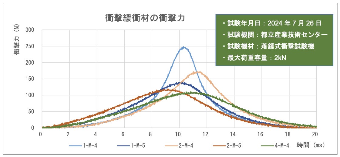 工業試験では異なる三種の素材を組み合わせて衝撃力を測定しましたが、いずれも基準値となる300Nをクリアし、確かな効果を元に商品化を開始することに至りました。