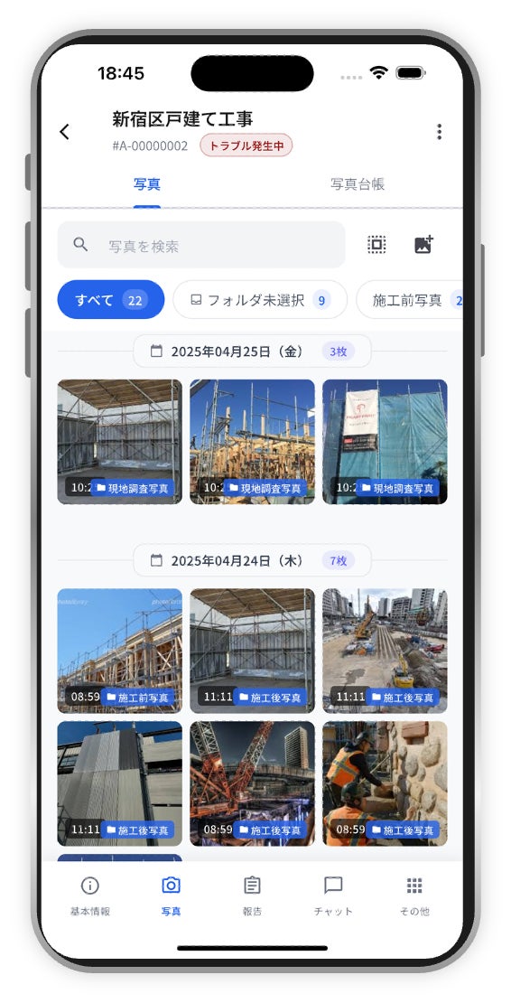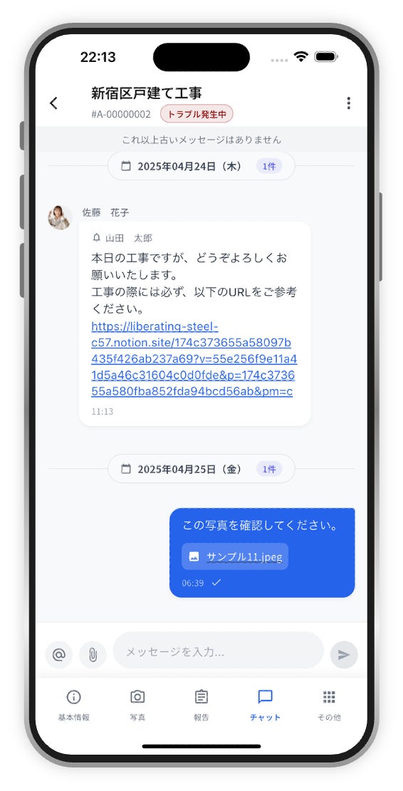 モバイルアプリの登場により、現場担当者はパソコンを開くことなく、スマートフォンから直接、案件確認、写真アップロード、報告書作成、チャットでのコミュニケーションなどが可能になり、現場の生産性が大幅に向上します。