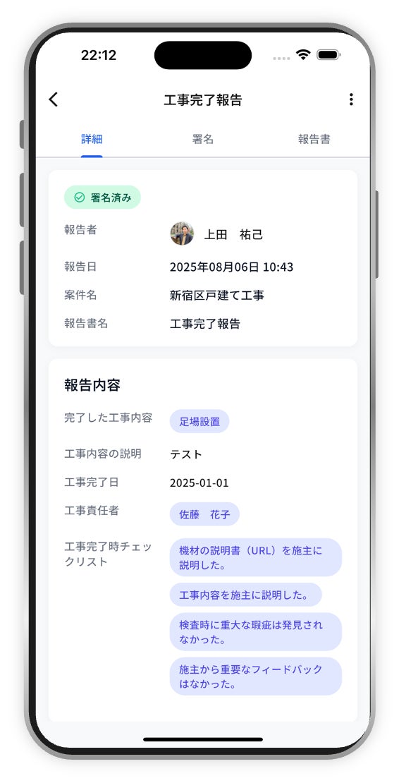報告データの登録 > 報告書の作成 > 報告書の共有までを簡単な操作で実施できるので、わざわざPCを開く必要はありません。