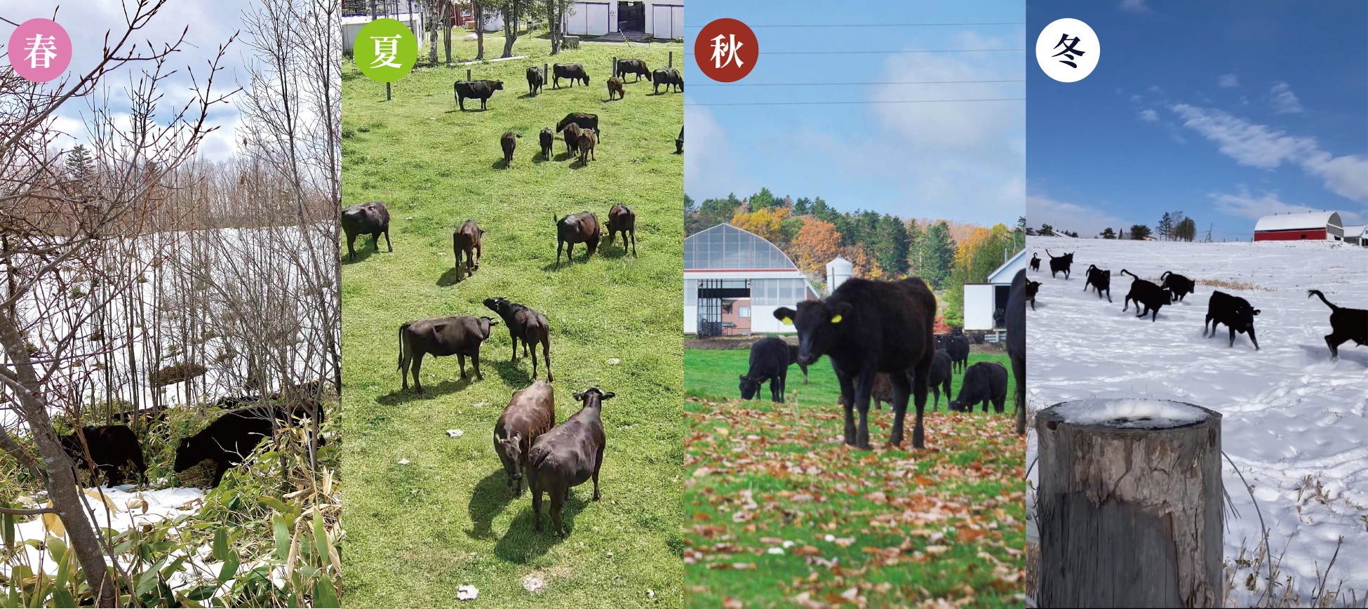 網走の広大な自然の中で完全放牧されています。牛舎に留まることなく、広大な牧草地を太陽の陽を浴びながら自由に歩き回ることができる環境は、牛にとってストレスが少なく健康的です。自然と調和したこの飼育方法により、アニマルウェルフェアが高度に実現されています。