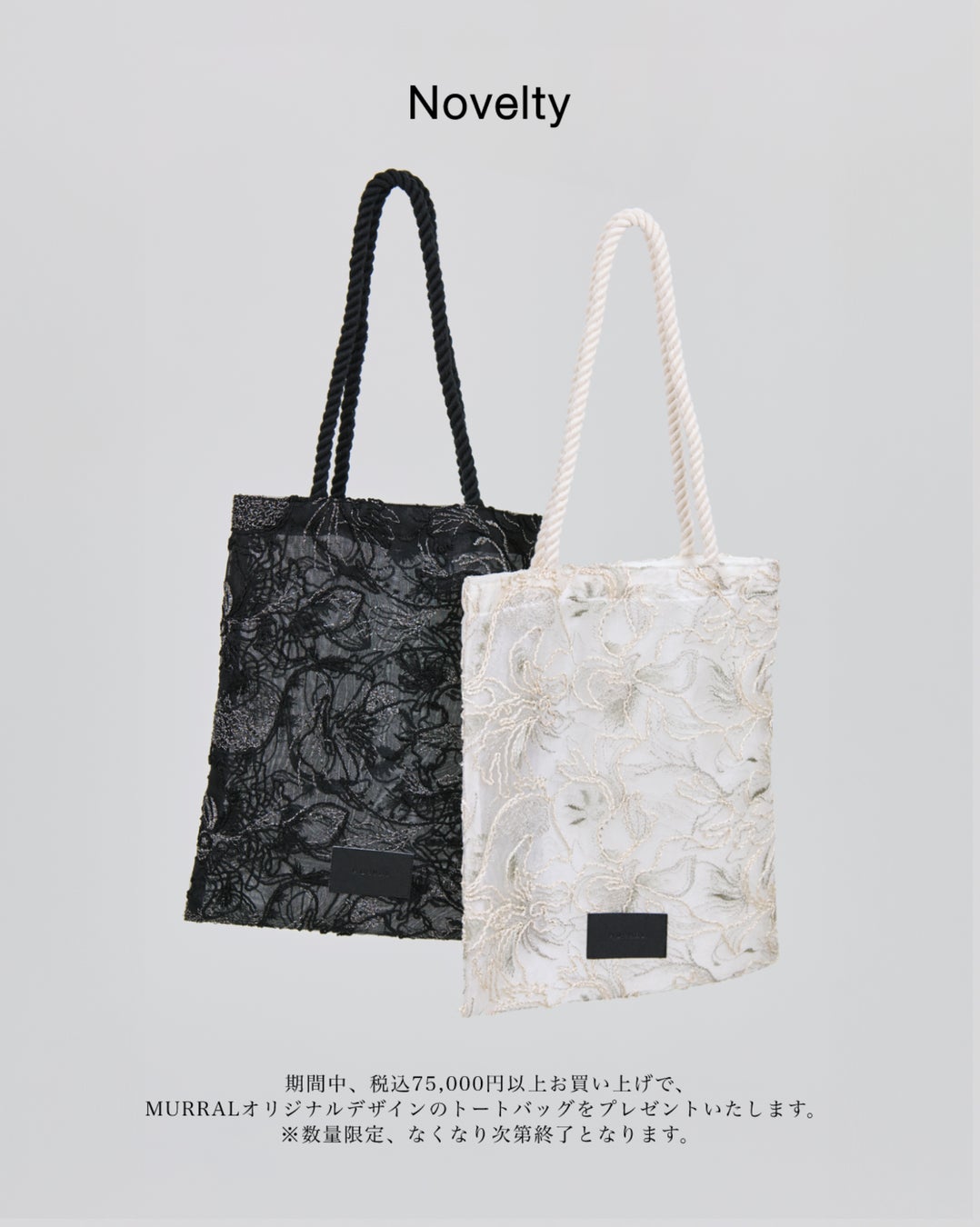 スペシャルギフトとして、両店舗でのPOP-UP開催期間中、税込75,000円以上お買い上げのお客様に、MURRALオリジナルデザインのトートバッグをプレゼント(※数量限定、なくなり次第終了となります。)や、オンラインで予約販売中のPetal sleeve lace dress (Black)のご試着・予約が可能です。(各店舗でご用意する期間が異なります。サイズ2のご用意のみ)