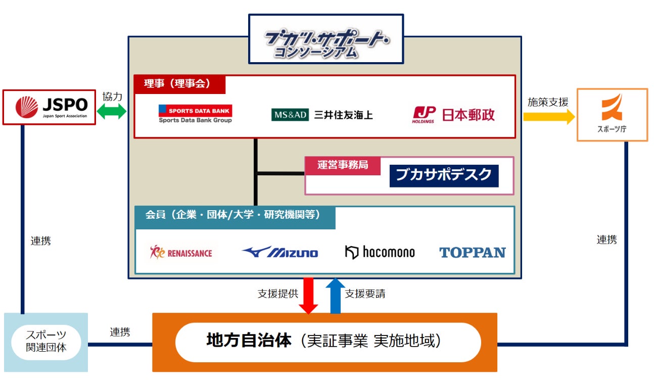 この度、株式会社ルネサンス(東京都墨田区、代表取締役社長執行役員 岡本 利治)、ミズノ株式会社(大阪府大阪市、代表取締役社長 水野 明人)、株式会社hacomono(東京都渋谷区、代表取締役CEO 蓮田 健一)およびTOPPANホールディングス株式会社(東京都文京区、代表取締役社長 CEO 麿 秀晴)の4社は、スポーツデータバンク株式会社(東京都中央区、代表取締役 石塚 大輔)、MS&ADインシュアランス グループの三井住友海上火災保険株式会社(東京都千代田区、代表取締役社長 舩曵 真一郎)および日本郵政株式会社(東京都千代田区、取締役兼代表執行役社長 増田 寬也)の3社が設立した「ブカツ・サポート・コンソーシアム(以下、「本コンソーシアム」)」の会員として新たに参画したことをお知らせします。