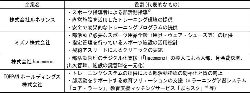 今回参画する4社は、人材・物資・財源の確保、運営・管理ノウハウの提供、DX化等、それぞれ異なる強みを有します。各社の専門性とリソースを結集し、協力体制を構築することで地方自治体に提供可能な支援メニューの拡充を図り、部活動の地域連携・地域展開の課題解決のさらなる促進につなげていきます。