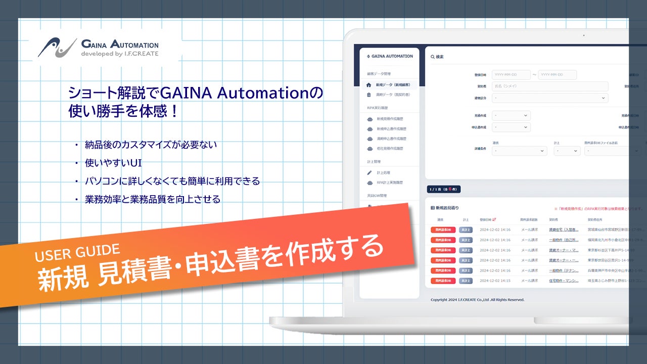 株式会社アイ・エフ・クリエイト(本社:東京都立川市、代表取締役:小川真一)は、自社開発したRPAサービス「GAINA Automation」の使い方を紹介する動画をYouTubeで公開しました。本動画は、サービスの特長や具体的な活用方法を分かりやすく解説し、多くの方にご活用いただける内容となっています。
