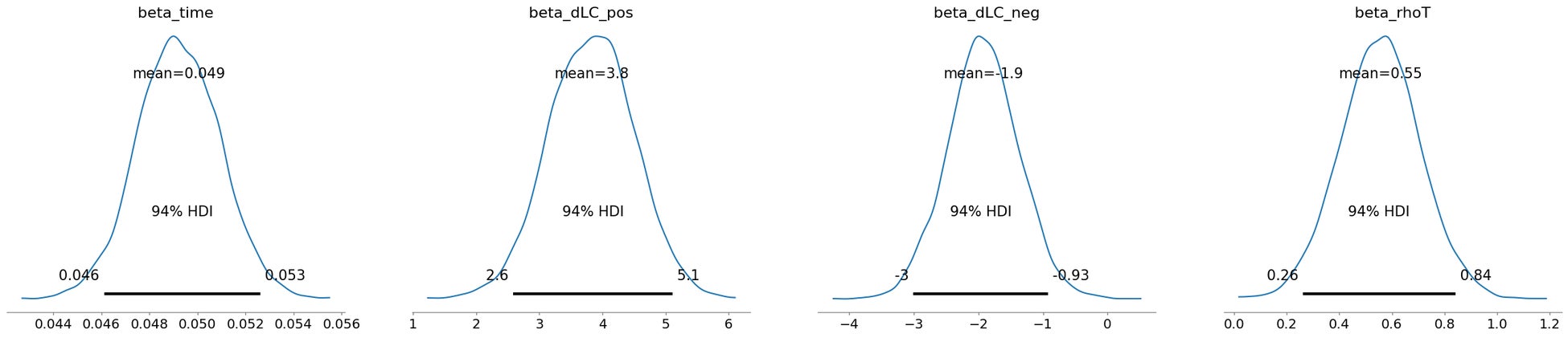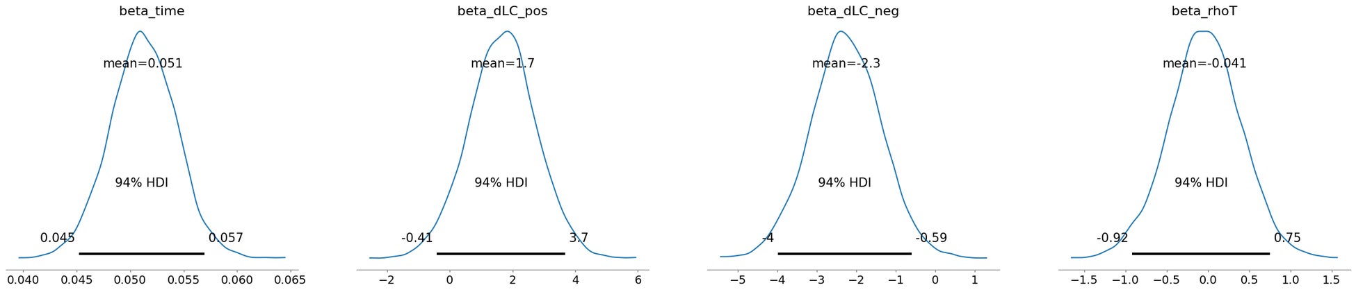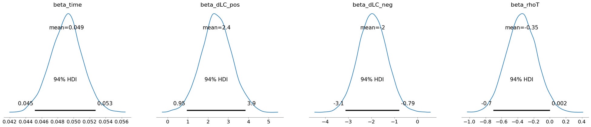 それぞれの分布は「94%信頼区間(HDI)」と平均値を表示。特に beta_dLC_pos と beta_dLC_neg が「0」をまたがず、モデルが正・負それぞれのジャンプを明確に区別して要因分解していることが一目で分かる。