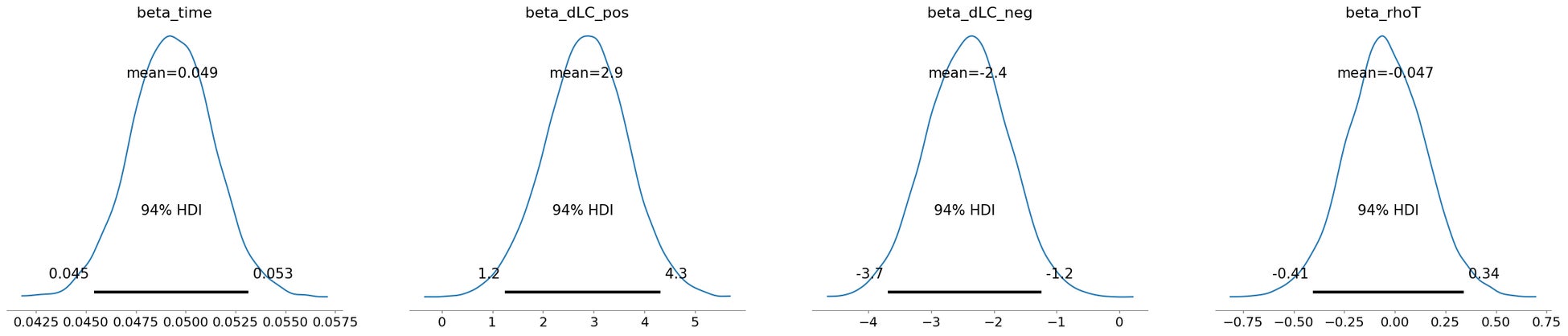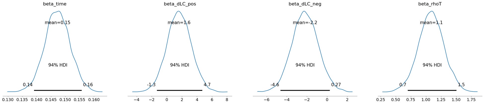 各パネルは主要な回帰係数(beta_time, beta_dLC_pos, beta_dLC_neg, beta_rhoT)の事後分布を示す。平均値と94%HDIを表示。beta_dLC_posは正、beta_dLC_negは負、beta_timeは全体のトレンド傾向を示す。beta_rhoTは局所ゆらぎの影響度。各要因の効果や確信度(不確実性)を事後分布として可視化。ジャンプイベントごとに“押し上げ”や“押し下げ”効果が明確に分離されていることがわかります。