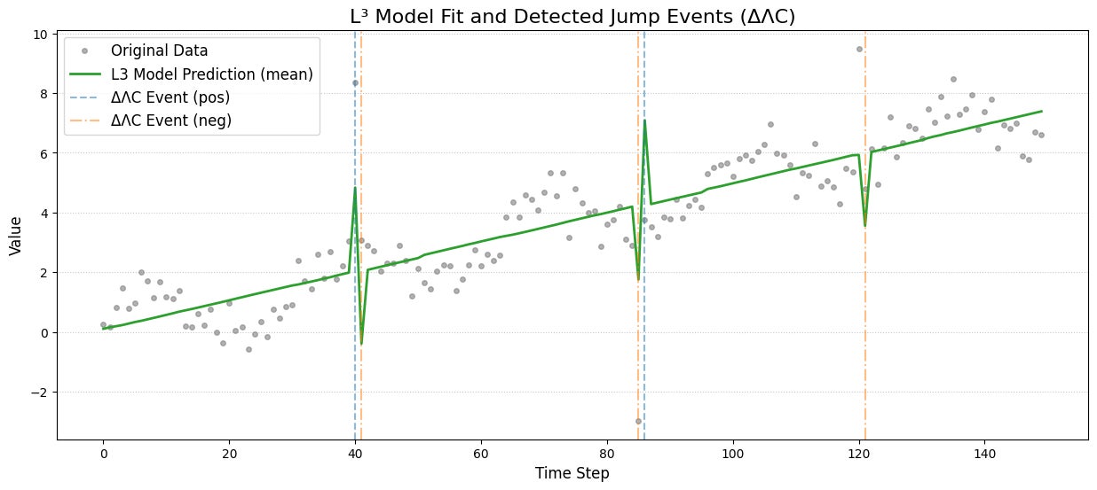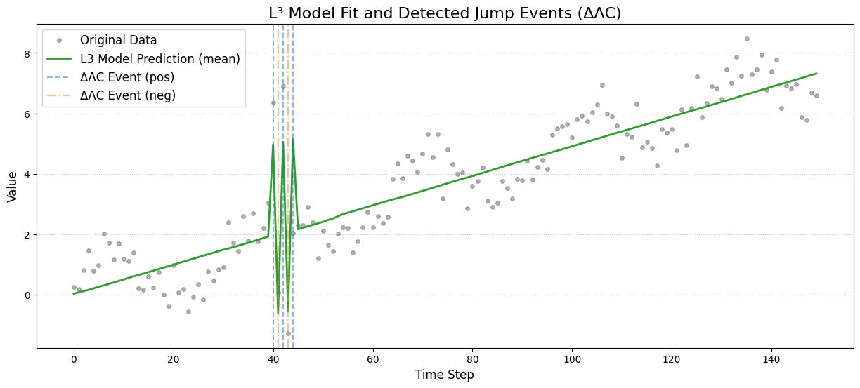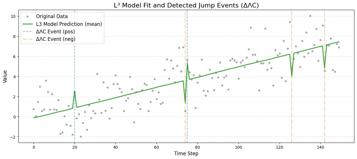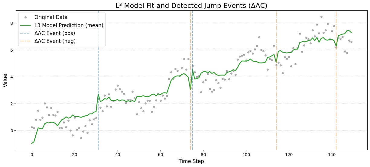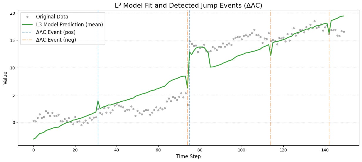灰色の点は、基礎トレンドに加え、t=30, 80, 110にジャンプ(急変)を加えた合成時系列データ。緑の線は、L³モデルの予測平均。青の破線が正のジャンプ(ΔΛC_pos)、オレンジの破線が負のジャンプ(ΔΛC_neg)を示す。モデルはトレンドと各ジャンプイベント(正負両方)を明確に分離・定量化できている。